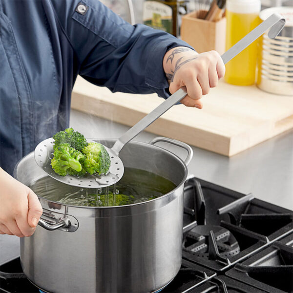 - Superficie perforada: Ideal para escurrir líquidos mientras retiene alimentos sólidos como frituras, verduras o ingredientes de caldos y estofados.