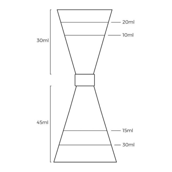 A pesar de su pequeño tamaño, su estructura en forma de reloj de arena permite contar con cinco medidas diferentes para el mismo vaso dosificador de licor, siendo de 10ml, 15ml, 20ml, 30ml y 45ml respectivamente en cada lado, con lo que resulta un utensilio perfecto para la preparación de cocteles, ya que no se pierde tiempo midiendo, ya que ambas medidas de cada cono del vaso dosificador son cantidades estándar ampliamente utilizadas en gran parte de los cocteles, y por ello facilitando el trabajo, esto al simplemente tomar la medida dada al ras de este vaso dosificador, consiguiendo con ello ahorrar tiempo y tener una mayor rapidez al preparar todo tipo de cocteles.